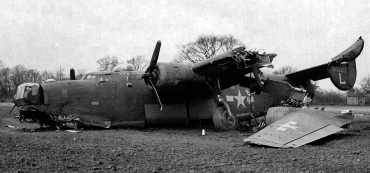 Caption Reads: "Crash landing of B-24J near Metfield, Norfolk, England on November 3, 1944."