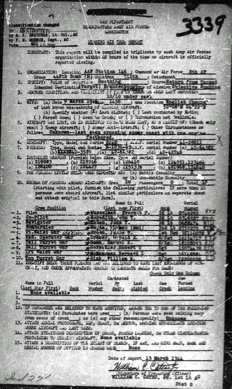 Lost 9 Mar 44, BEL - MACR 3339 - Pilot Everett P. Musselman
