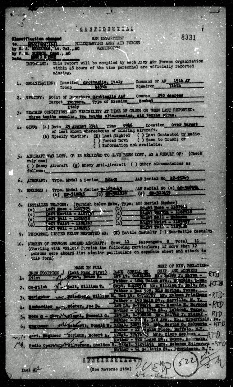 Lost 29 Aug 44, ITA - MACR 8331 Pg1 / Pg2 - Pilot Bruce R. Bryan