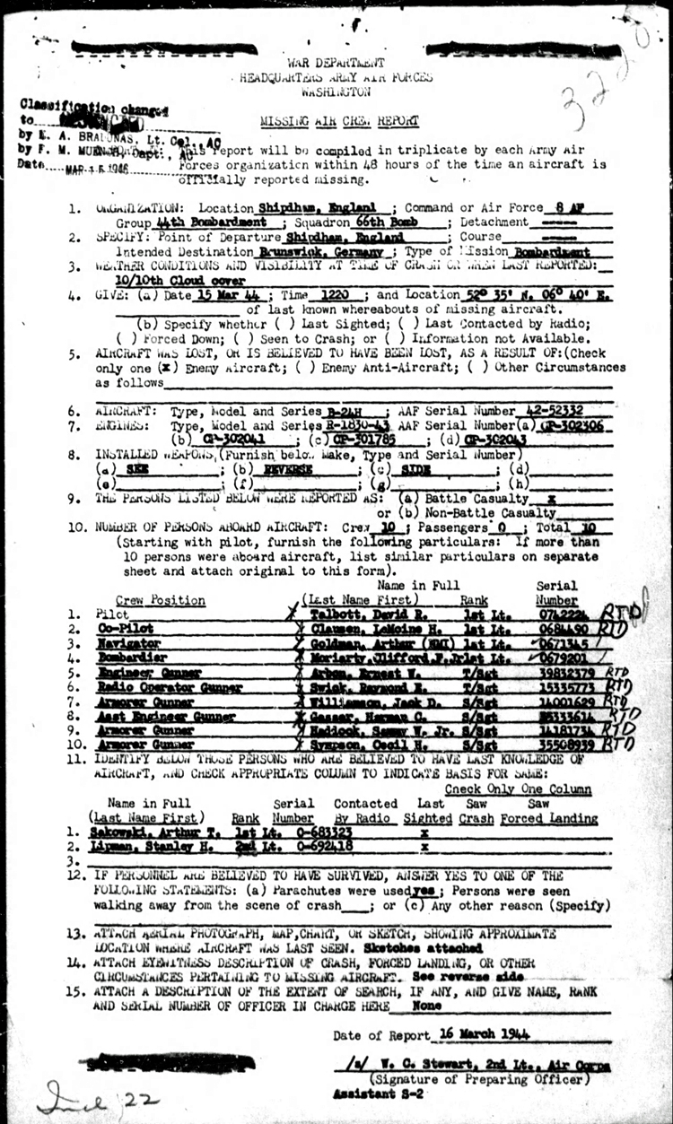 Starboard (Right) Side - Lost 15 Mar 44, GER - MACR 3220 - Pilot David R. Talbott