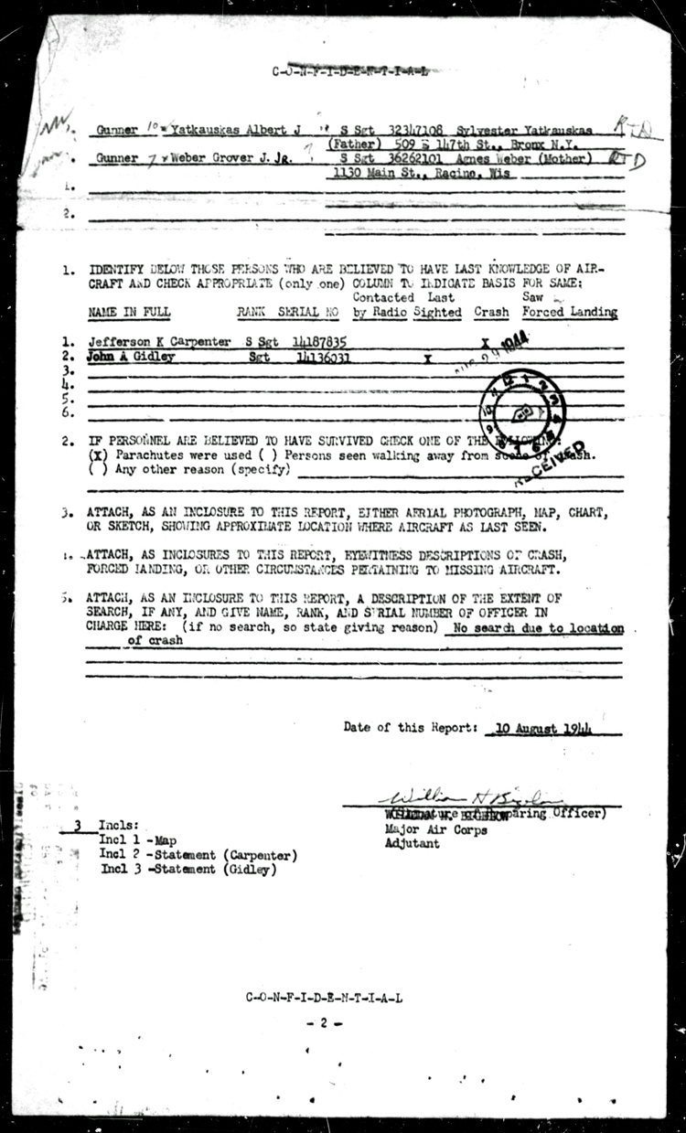 Lost 7 Aug 44, GER - MACR 7203 Pg1 / Pg2 - Pilot Cecil R. Bates