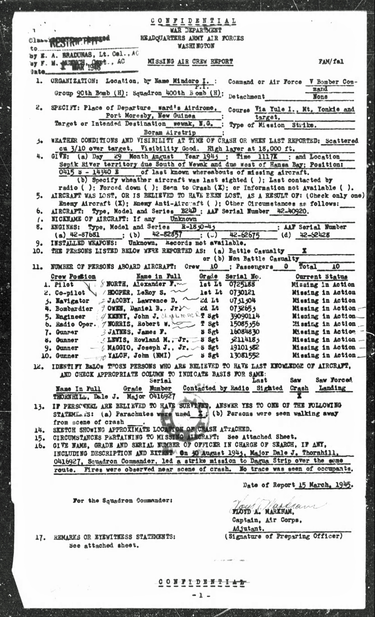 Lost 29 Aug 43, PNG - MACR 13578 - Pilot Alexander F. North