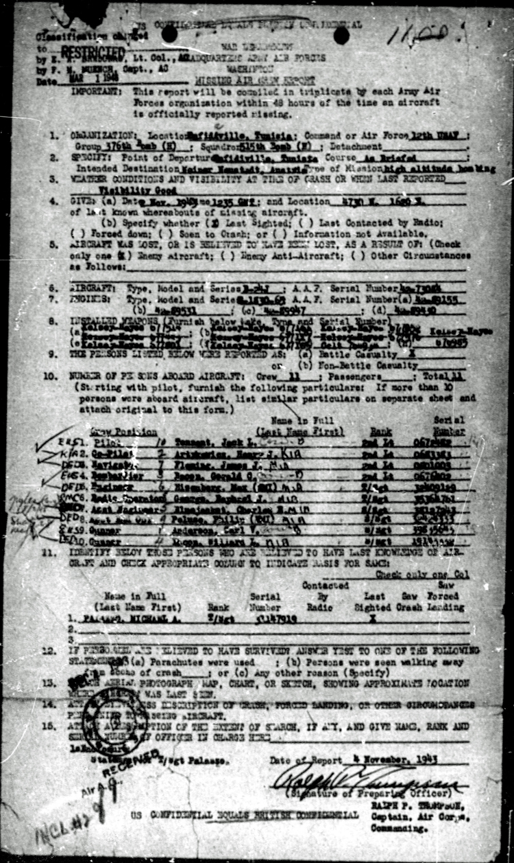 Damon Runyon "Gangster" Character - Lost 2 Nov 43, AUT - MACR 1100 - Pilot Jack L. Tennant
