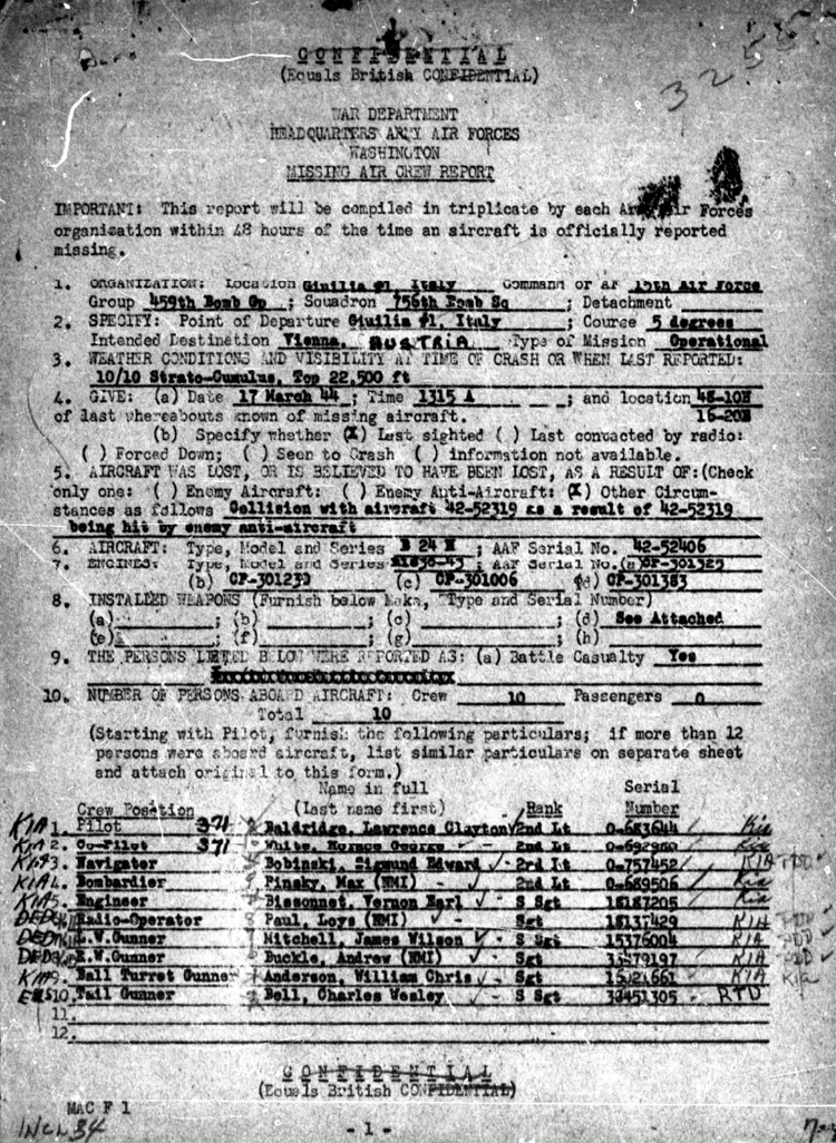 Mid-Air Collision with LA BORRACHA (42-52319) 17 Mar 44, AUT - MACR 3255 - Pilot Lawrence C. Baldridge