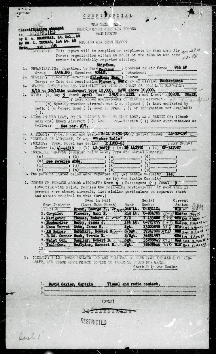 Brown Jr. (Pilot), along with S/Sgt. Travis E. Nash (Radio